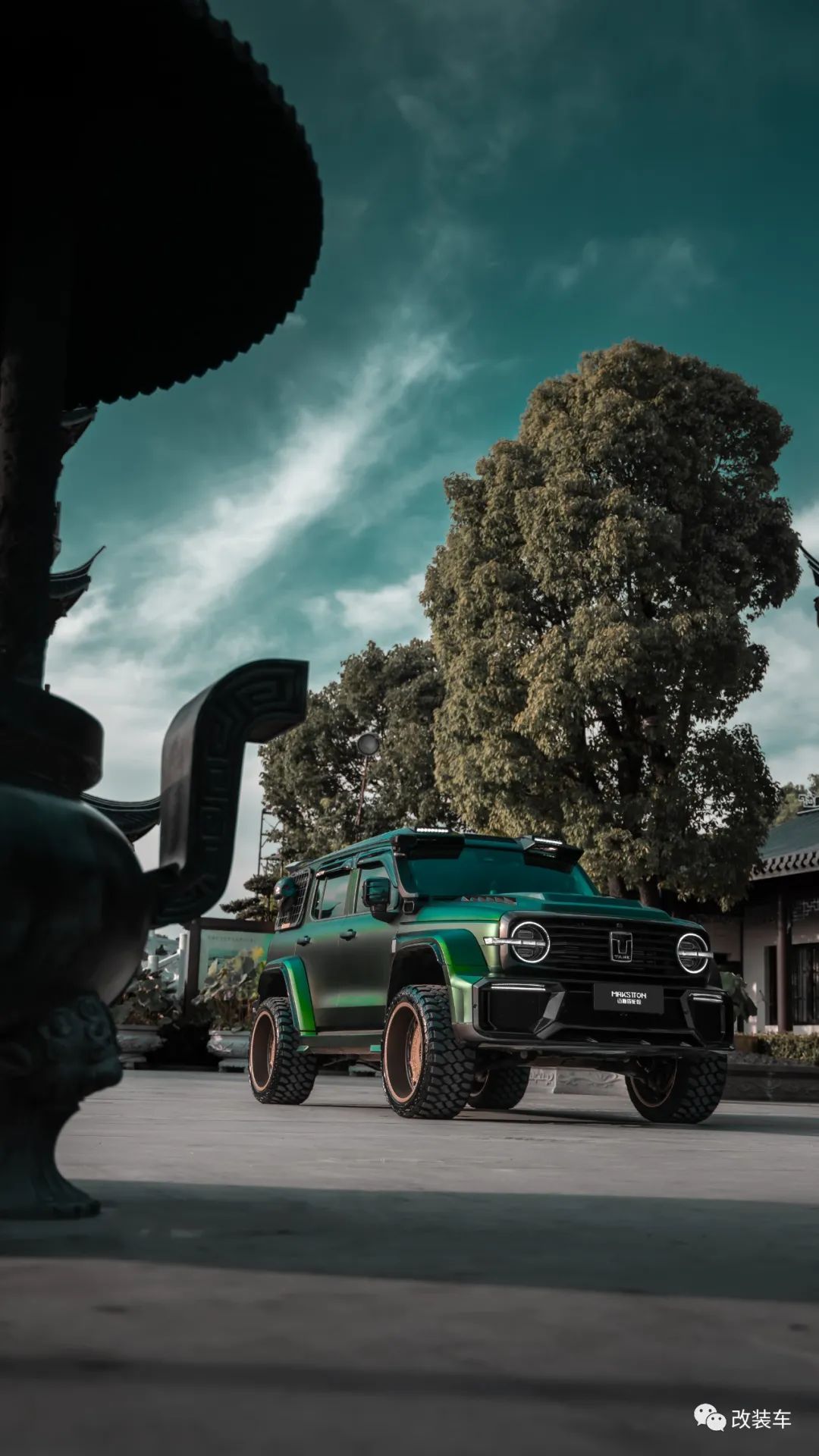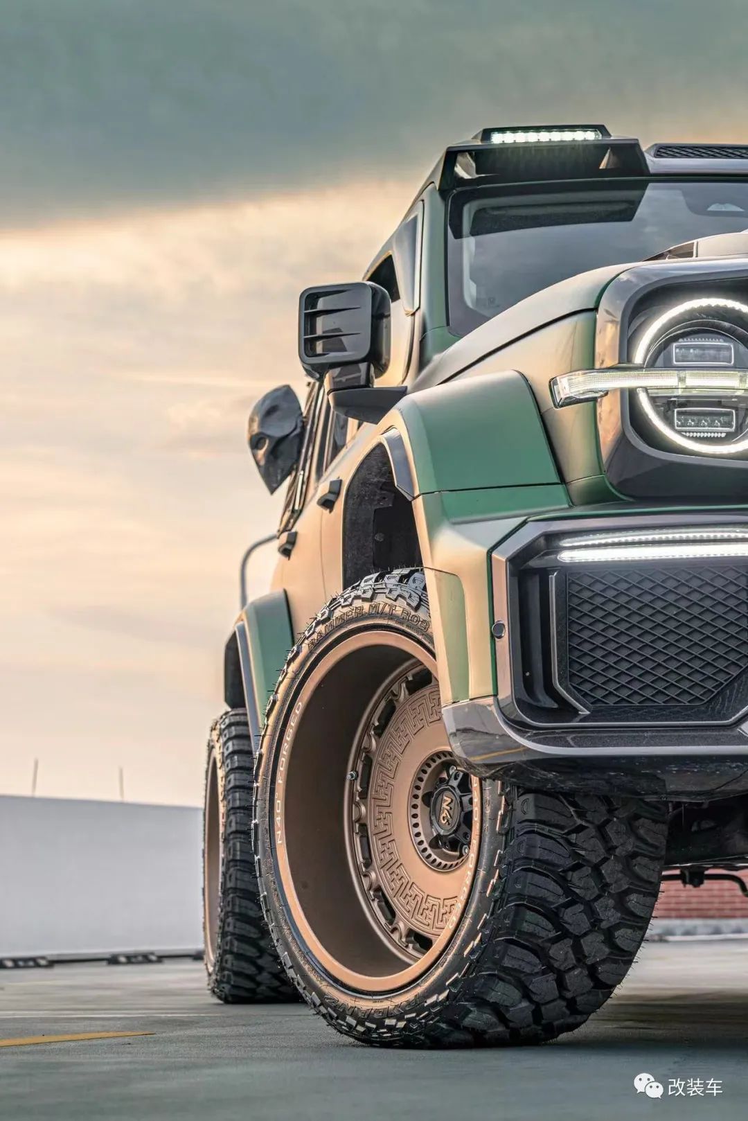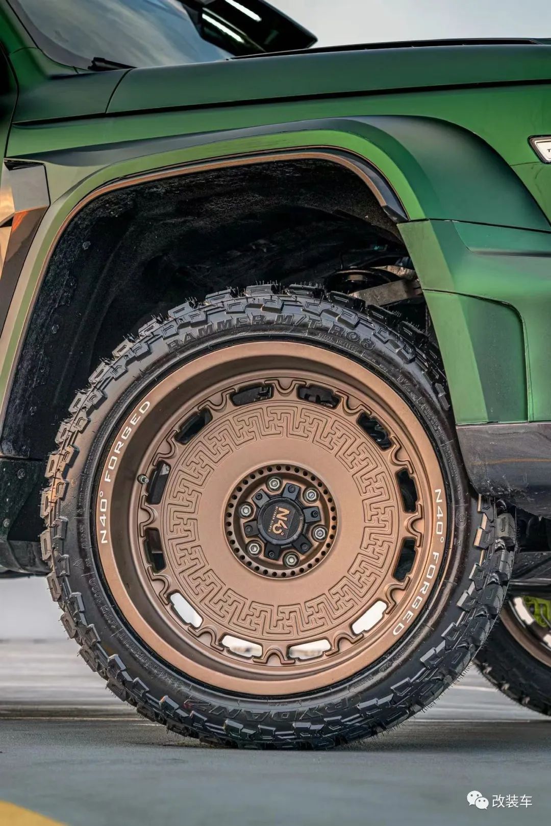"后面又重新贴了一身质感更好的AUTOAFCE的毒液绿车身膜,轮毂也换成了一套迈斯盾专门为我设计出的复古风轩辕22寸大轮毂,搭配上雷登22寸MT胎。越野性能不敢跟人家比,但颜值这块拿捏得稳稳的。"