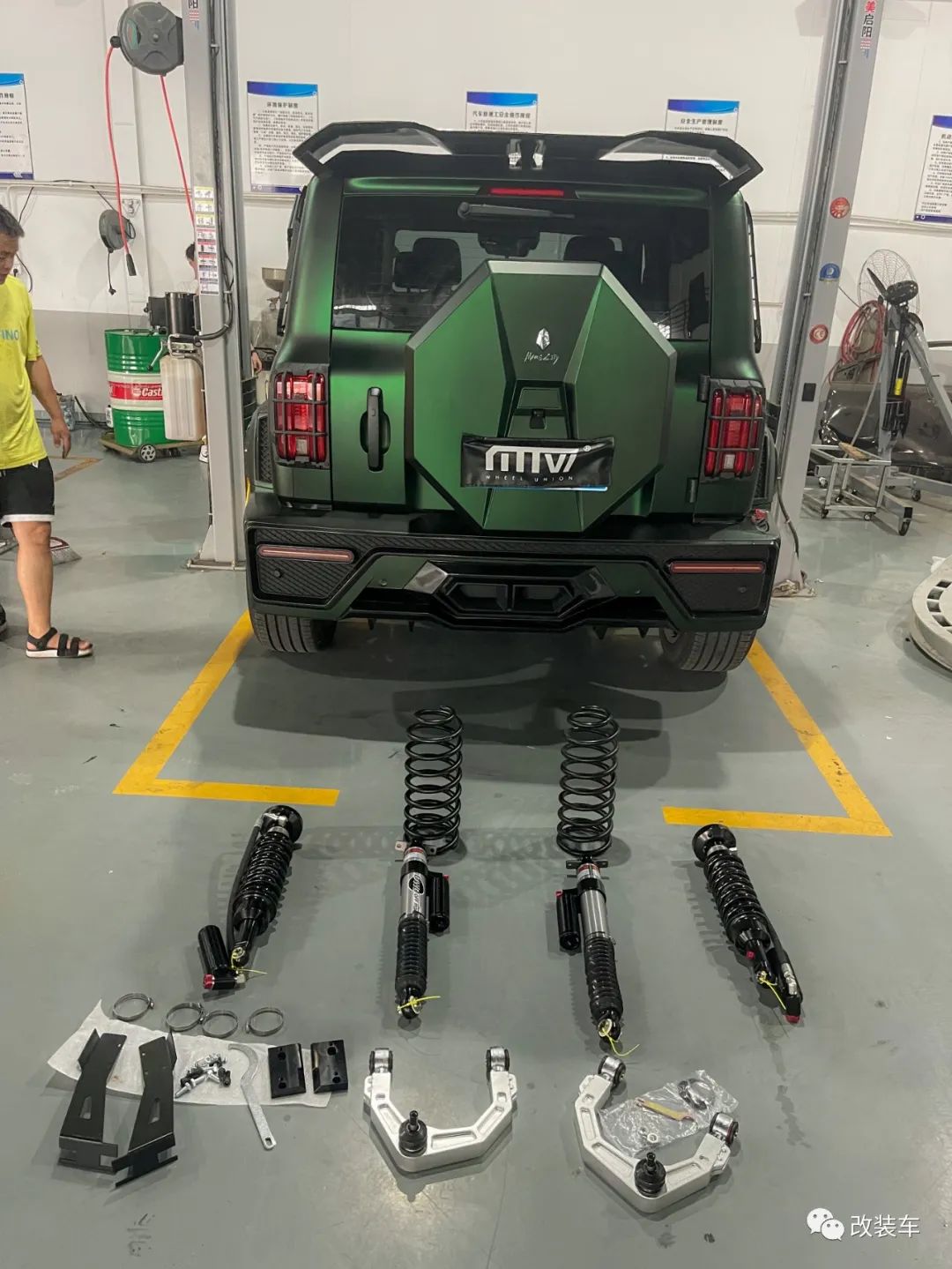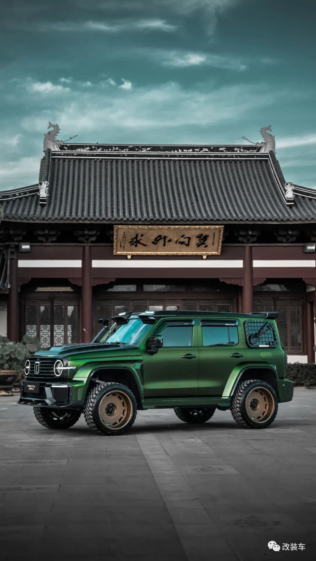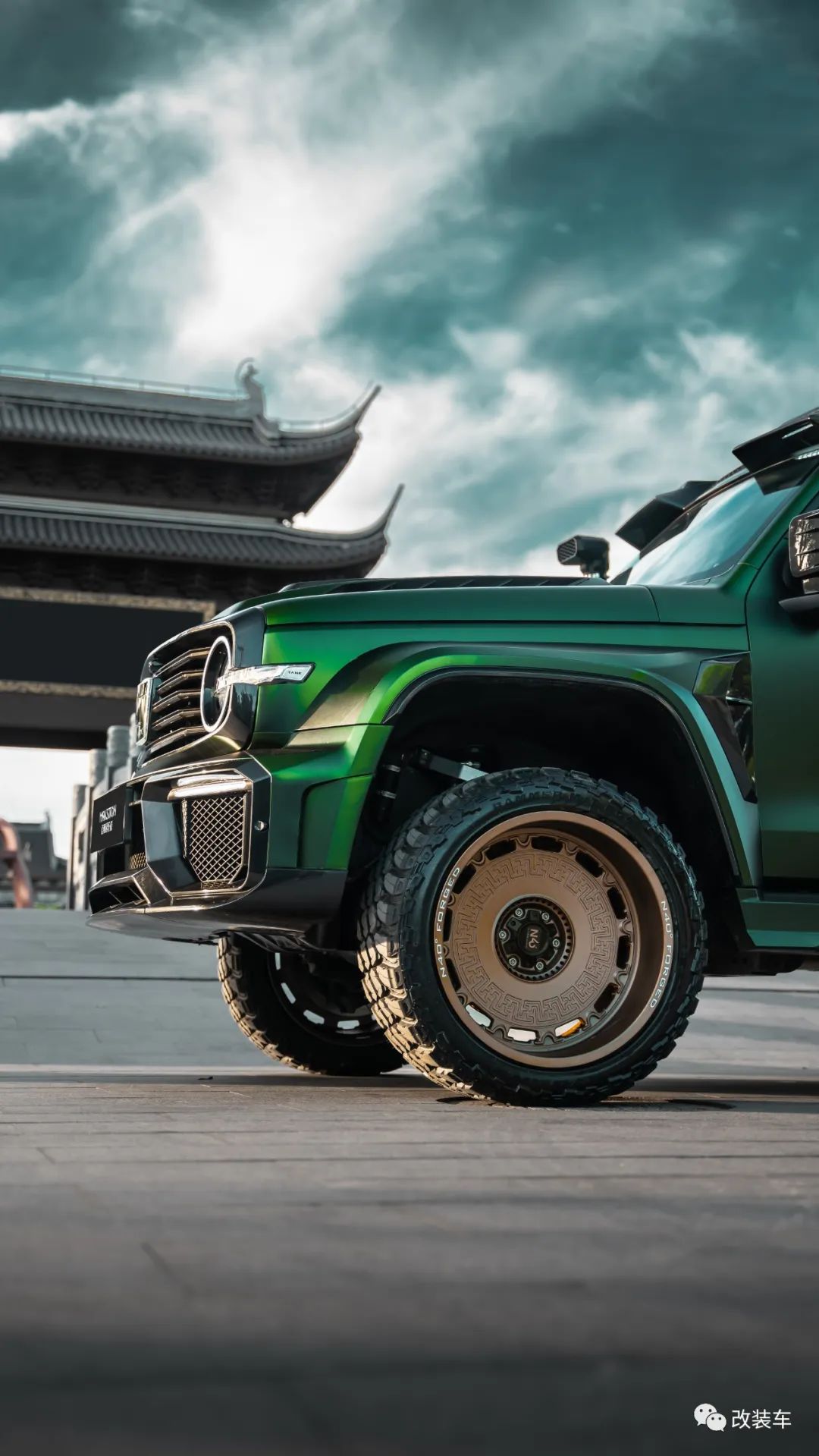"后面又重新贴了一身质感更好的AUTOAFCE的毒液绿车身膜,轮毂也换成了一套迈斯盾专门为我设计出的复古风轩辕22寸大轮毂,搭配上雷登22寸MT胎。越野性能不敢跟人家比,但颜值这块拿捏得稳稳的。"