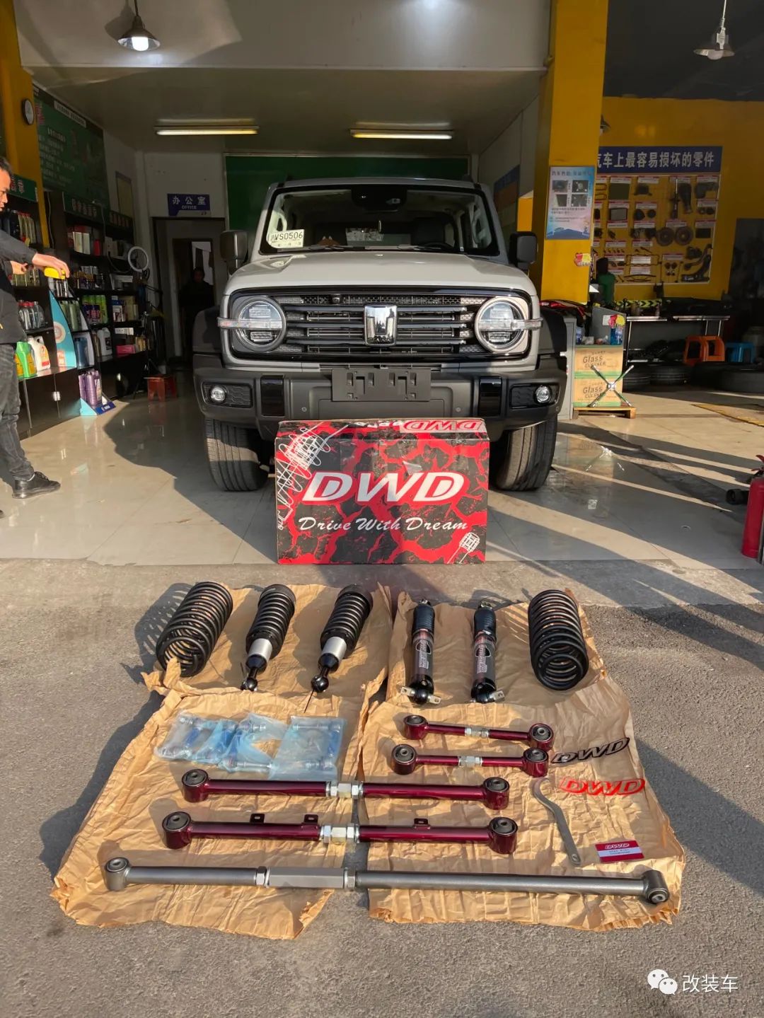 "但好景不长,因为当时装避震的时候被我升太高了,弹簧行程变短,一辆越野车过个减速带都痛苦,后来就换上了一套DWD DD7氮气避震,这下就舒服多了。"