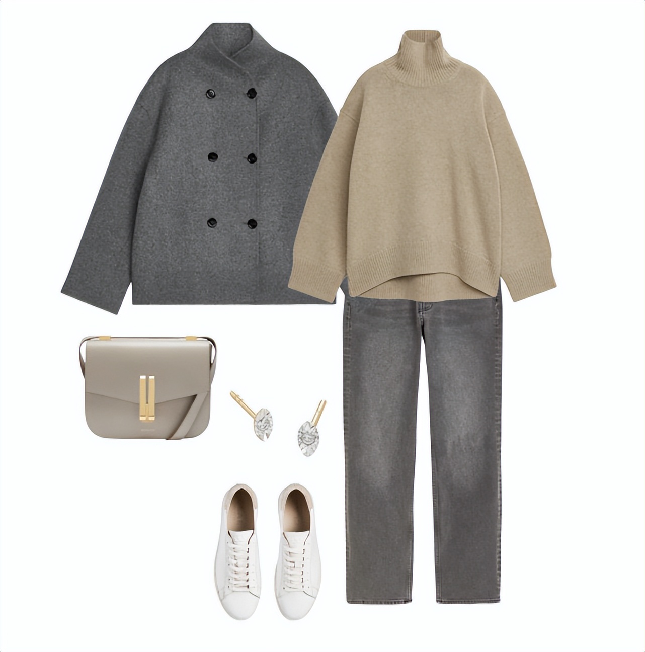 或是立领呢子夹克换成灰色调,咖色则作为高领毛衣的款式,穿出40岁+女性的大方有型。
