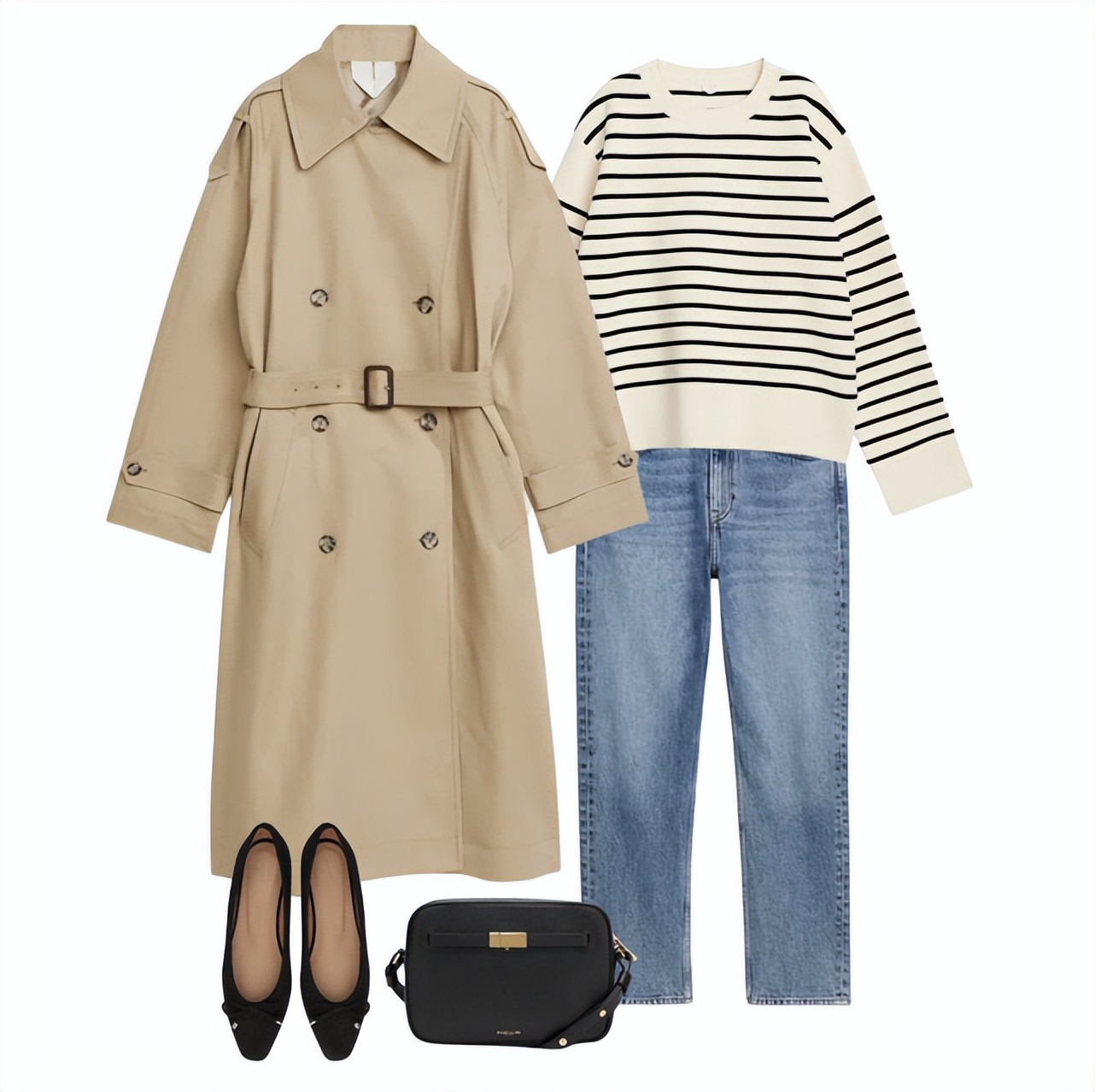 如果为长风衣和牛仔裤搭配条纹毛衫,会穿出简约但也知性的风格。记得把鞋子换成更职业感的黑色芭蕾平底鞋,穿出轻巧的法式风格。