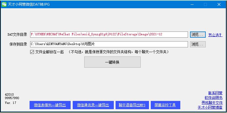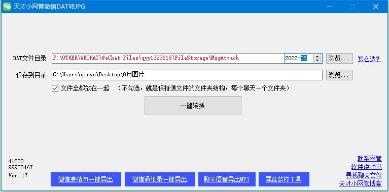 2、如果你需要清理DAT图片又怕清理了重要文件,可以人工筛选上面转出来的图片,留下重要图片,删除没用的图片,然后使用下面这个工具快速清理DAT文件,不影响在微信里查看它,具体用法在清理工具里有的