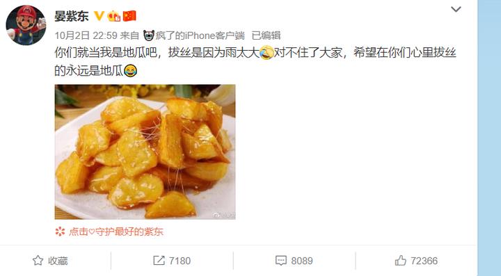 节目播出后,晏紫东在自媒体称:“你们就当我是地瓜吧,拔丝是因为雨太了,对不住了大家,希望在你们心里拔丝的永远是地瓜。”并配了一盘拔丝地瓜的图。