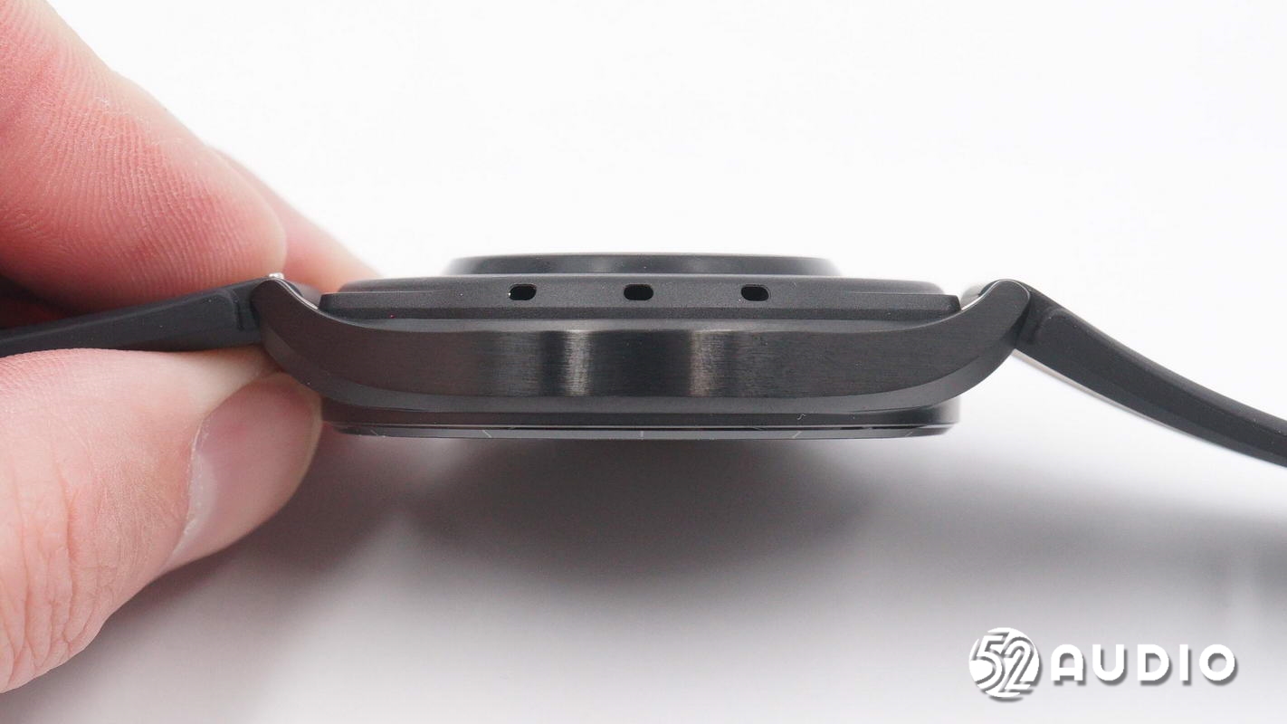手表右侧设置有两颗数字表冠,支持通过按压对手表进行操作。表冠下方的后壳表盖上是扬声器出音孔。