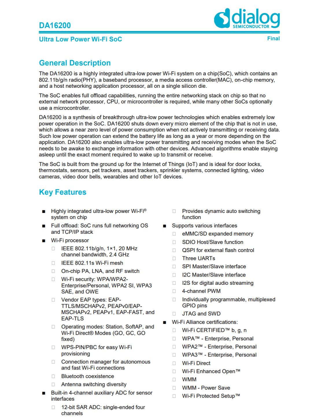 dialog戴泺格DA16200 WiFi SoC芯片,是一款高度集成的超低功耗的WiFi SoC芯片,芯片内置基带处理器,内存,处理器,功放和放大器等,用于无线连接。