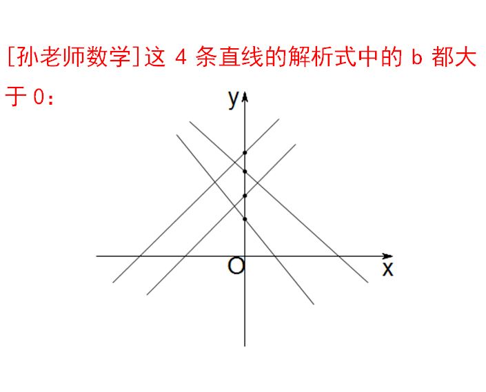 b是直线y=kx+b与y轴交点的纵坐标,所以b>0时,直线与y轴正半轴相交,反过来也成立,即若直线与y轴正半轴相交,则b>0;b<0时,直线与y轴负半轴相交,反过来也成立,即若直线与y轴负半轴相交,则b<0。如下图:
