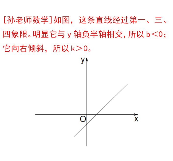 再如:k>0且b<0时,直线y=kx+b经过第一、三、四象限;反过来,若直线y=kx+b经过第一、三、四象限,则k>0且b<0。如图所示: