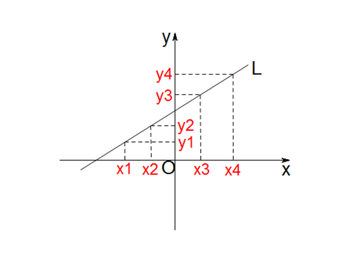 如图,L是一条向右倾斜的直线,解析式为y=kx+b(k>0),x4>x3>x2>x1。当x的值从x1逐渐增大到x4的过程中,对应的y值从y1逐渐增大到y4。简单地说,就是当k大于0时,若x的值增大了,则根据解析式y=kx+b求得的y的值也会随之增大。这就叫y随x的增大而增大。