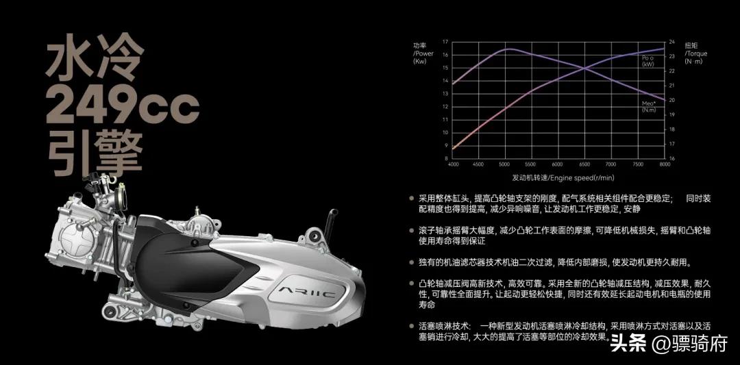 戈壁250搭载的250cc水冷四气门发动机,最大马力扭矩分别为22.5hp/7500转±250转、23.5Nm/5000转±250转。