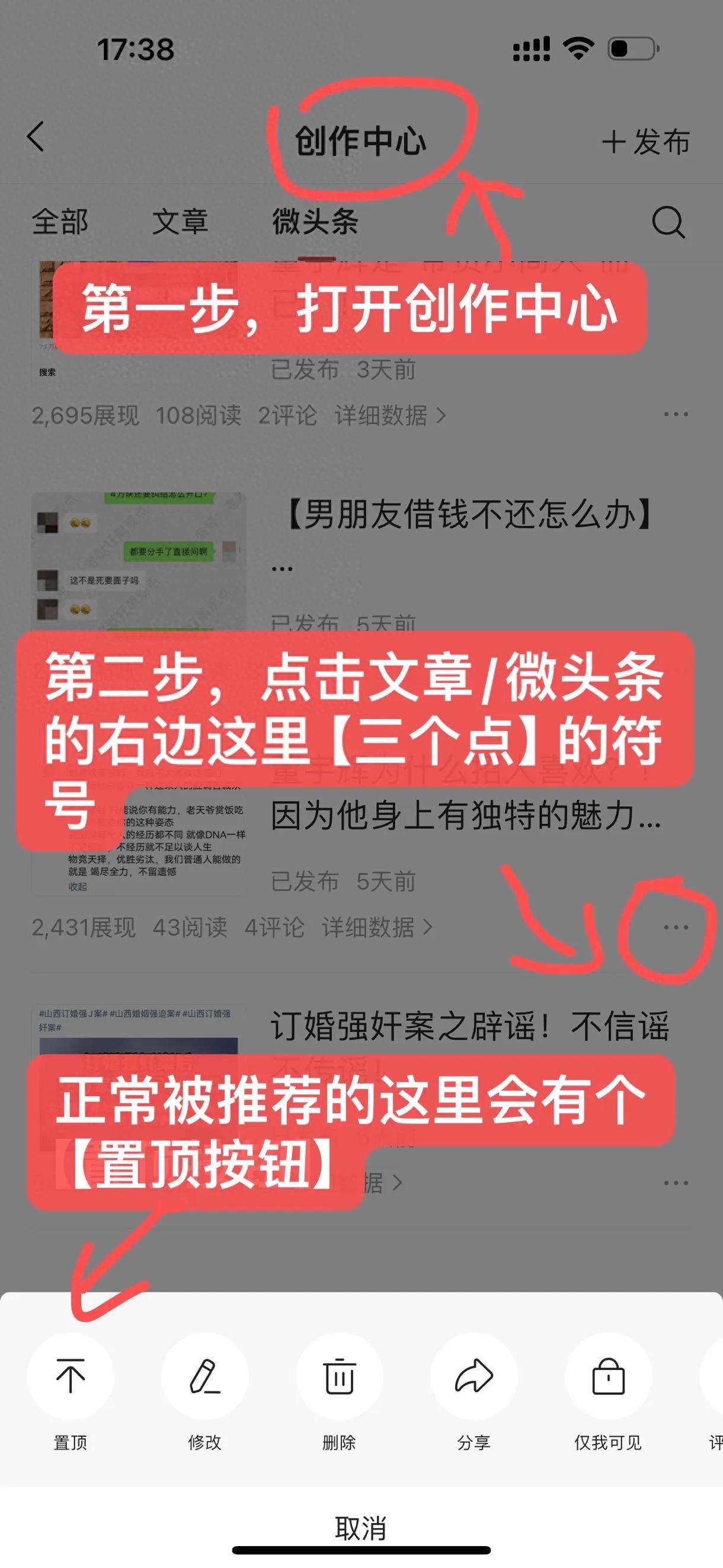 如果是正常被推荐的文章或者微头条,这里会有这个【置顶】选项的按键。