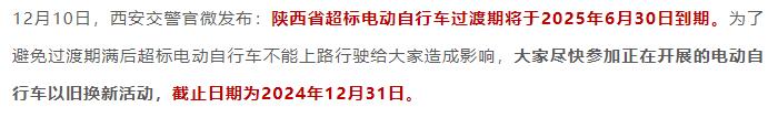 12月10日,陕西西安交警官方公众号发布通知,陕西省超标电动车过渡期将于2025年6月30日到期,而且要求到期以后,超标电动车不能够上道路行驶,同时提醒广大车主,目前的以旧换新活动截止时间为2024年12月31日。