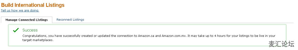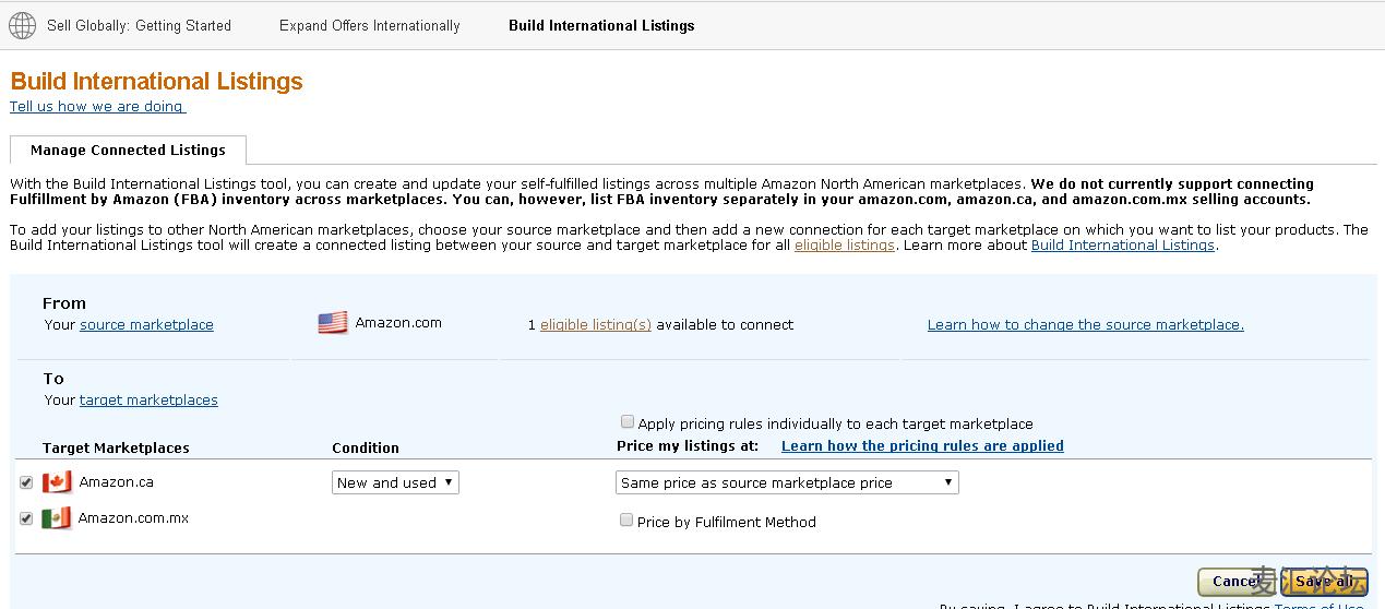 相信你们这时已经反应过来了,Build international Listings实际上就是建立一个Sourcemarketplace (源站点)和Target marketplace (目标站点)的价格连接(Connection);通过这个Connection,它会自动根据你设置的价格规则将Source marketplace 的价格套入到Target marketplace:不要期望将listing内容同步过去,listing还是要手动上传的。