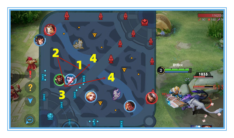 - 典韦前期蓝开,按照我标注的1→2→3→4的顺序,可以直接两分钟的时候去中路河道抢河蟹,中路的河蟹经验和经济收益很高,不弱于红、蓝buff这样的大野怪(能单吃最好)。