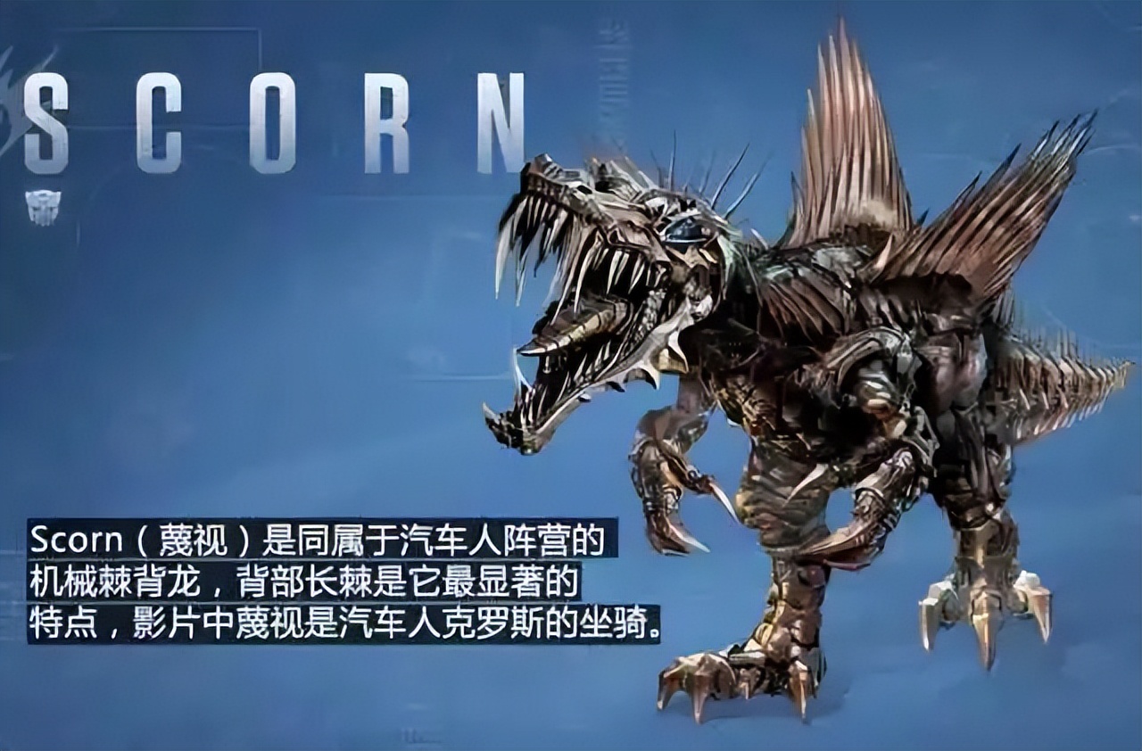 比如《变形金刚4》里的机器恐龙部队,就原创了一个新角色——“藐视”,其伪装形态,就是棘龙。