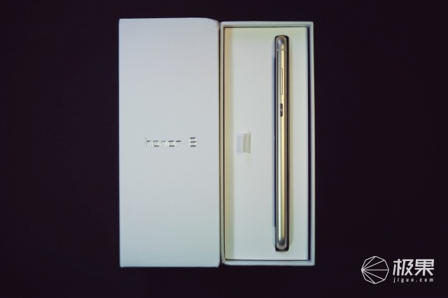 荣耀8采用纯白色的包装,将烫金的LOGO放在长方体盒身的侧面,别致优雅。包装的材质并不像目前市场上友商采用的平板纸盒包装,在包装的表面压印了均等的浅横纹理,这样的设计更多的对产品的触感进行了提升,有趣的是这刚好与荣耀8的视觉设计产生互补。