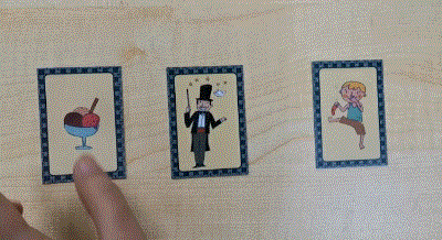 取出三张形状一样的卡片,先指定要找的卡片是哪一张,然后快速的左移右换,打乱顺序。最后让孩子找出指定的那张卡片在哪里。