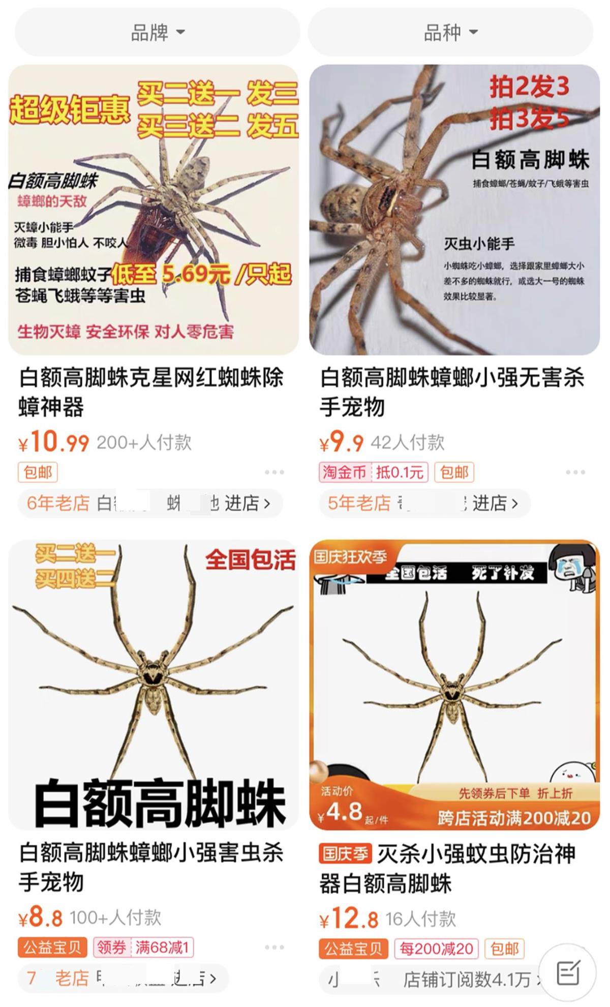 随后记者打开某购物平台,搜索“白额高脚蛛”,共有100多个结果。记者点击打开一家店铺,网站介绍,该蜘蛛有10至14厘米长(包括脚),生性胆小不主动攻击人,常见于市内。白额高脚蛛可算益虫,可连续捕捉多只蟑螂,放任家中白额高脚蛛生存,可达自然杀蟑螂之效。白额高脚蛛可人为饲养,耐饥力很好,一个星期只喂一两次即可。