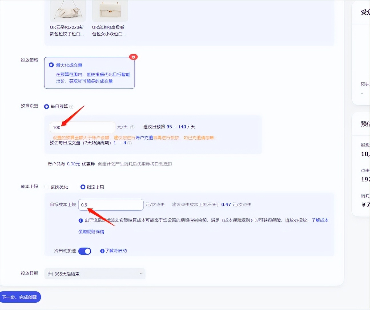 第一组计划,选择自定义商品,最大化成交量,日限额根据自己情况出,成本上限选择系统优化即可!