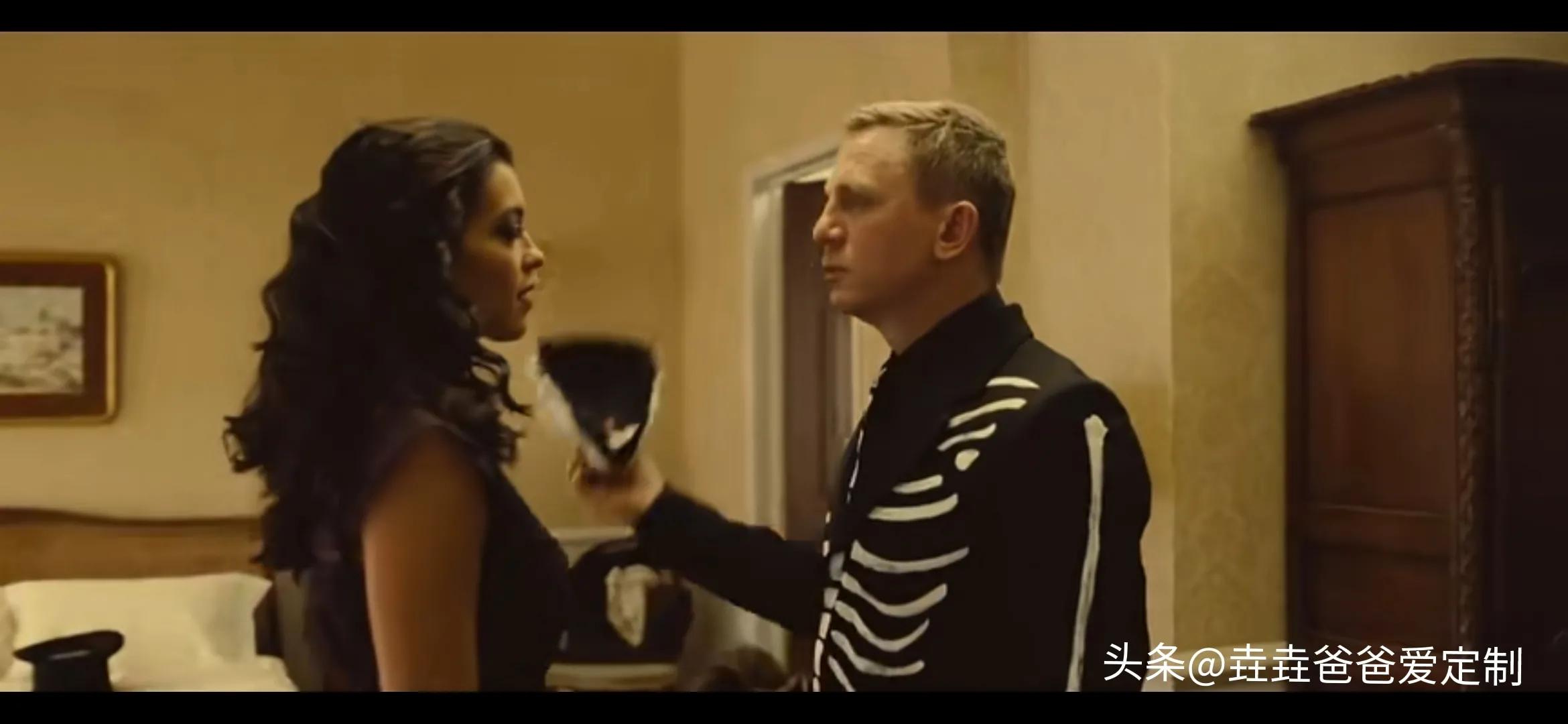 故事开头在墨西哥的街头,邦德带着面具跟踪白色西装男,他带着女伴进去酒店,摘下面具的他迷倒万千少女,在女伴摆好姿势后,