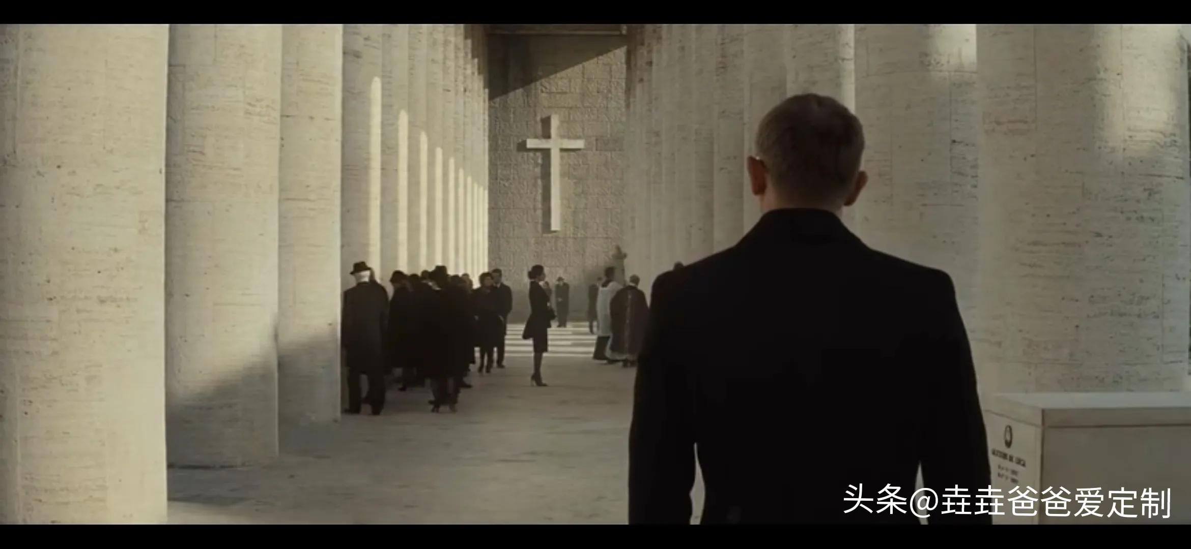 邦德偷开了马丁车,来到罗马街头。根据情报找到了葬礼的所在地,女神出现了!女神身穿一身黑色丧服,面带黑纱,真是美得不要不要的!