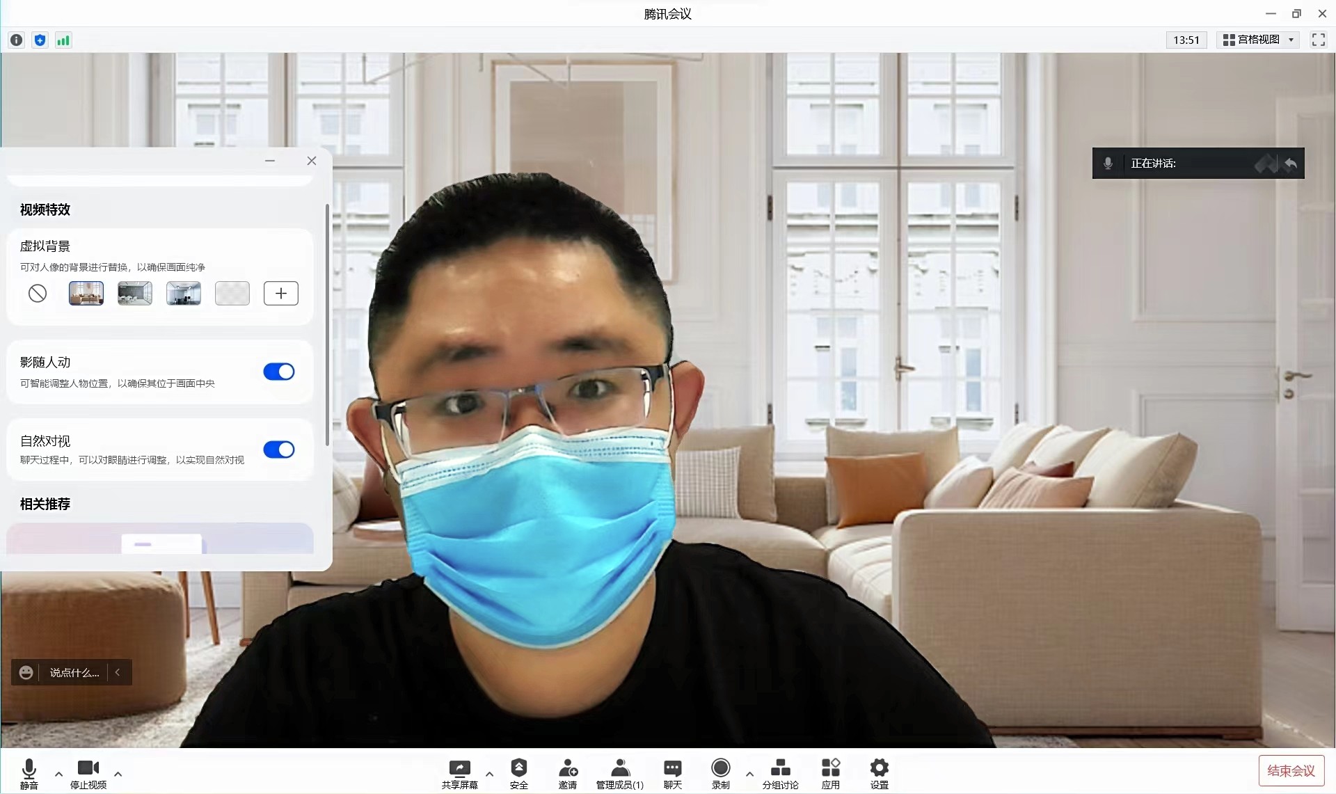 不仅如此,华为自研的AI Camera智慧特性,还带来了虚拟背景、影随人动、自然对视三大功能。经过实测,现在用户不仅能够随意自定义自己的虚拟会议背景,防止发生室内私人空间露出的尴尬情况,还能实现对演讲者的实时跟踪以及对用户的眼部细节调整。
