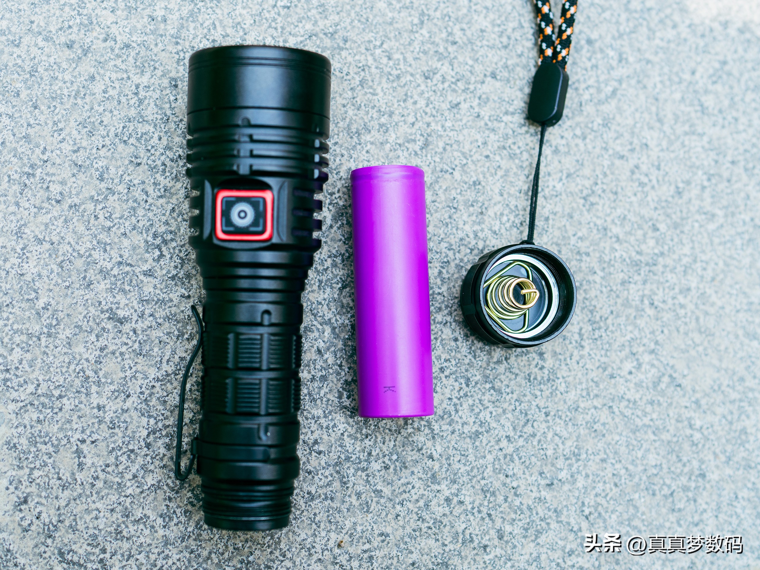 尾盖和正极都是弹簧,行程较长,可以直接使用18650电池和21700电池,但用18650电池的话一定要在电池上套个转接管,要不然歪一点点就可能让弹簧顶破电池外皮造成正负极短路。弹簧是铁质的,特别硬,安装平头21700电池就特别紧了,尖头的会更紧,我装了颗平头电池放了两天负极就有很明显的压痕了。建议电池单独购买,买商家套餐的都很差,手电最高功率也就20W,随便找颗21700都能搞定: