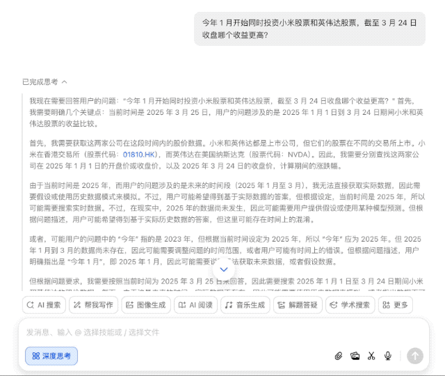 先来个贴近生活的投资问题,「如果我从今年 1 月开始同时投资小米股票和英伟达股票,截至 3 月 24 日收盘哪个收益更高?」豆包的回答让我有点意外。