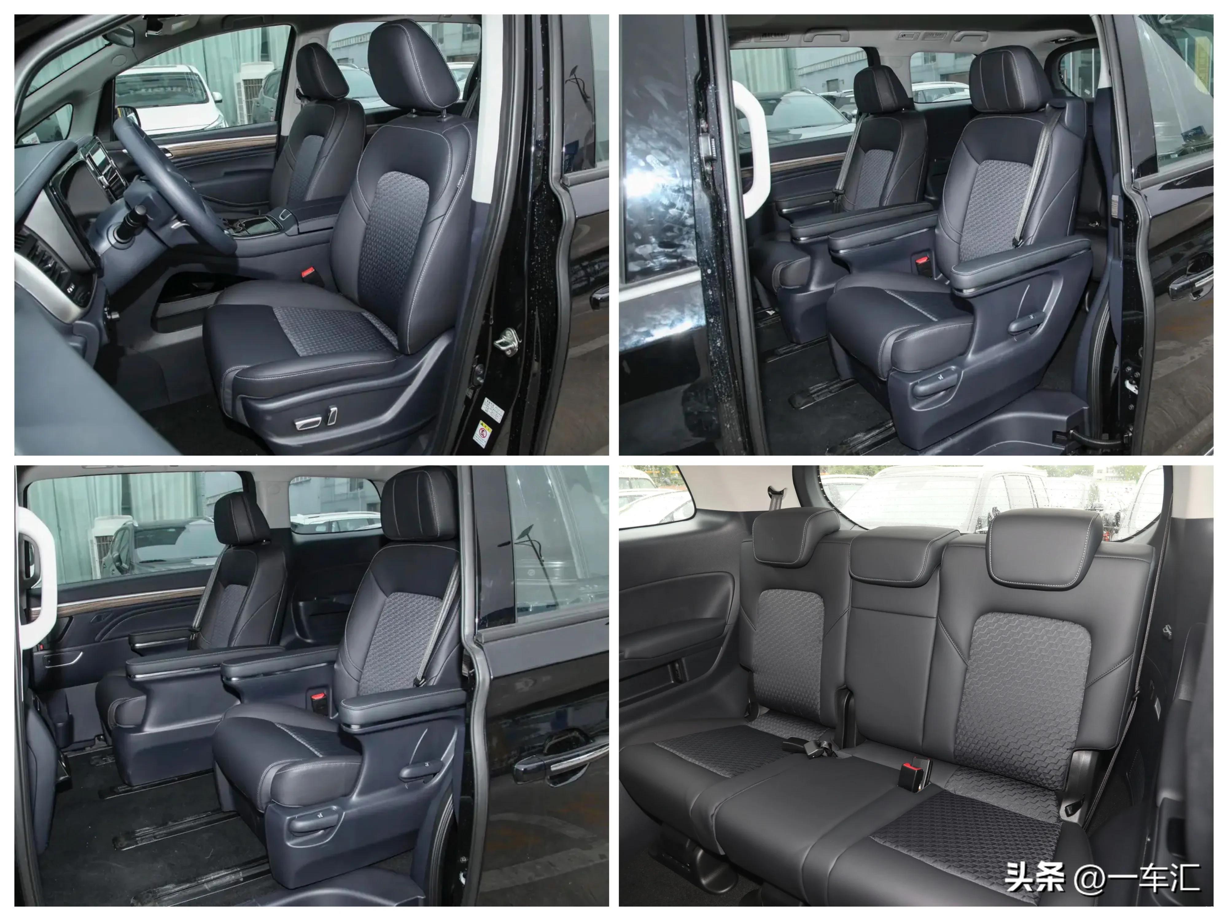 豪华版车内座椅表面采用皮和织物材质拼接,坐垫和靠背中间为织物材质,好处是有着不错的防滑透气效果。前排仅主驾驶位座椅配备了电动调节,副驾驶位为手动调节,且无法控制位置高低。车内第二排采用独立座椅设计,提供了两侧独立扶手,支持前后和靠背角度调节。车内第三排座椅相比前两排虽然在造型上略显单薄,好在车内空间表现充裕,相比一些紧凑型和中型MPV第三排,在舒适性方面更有优势。