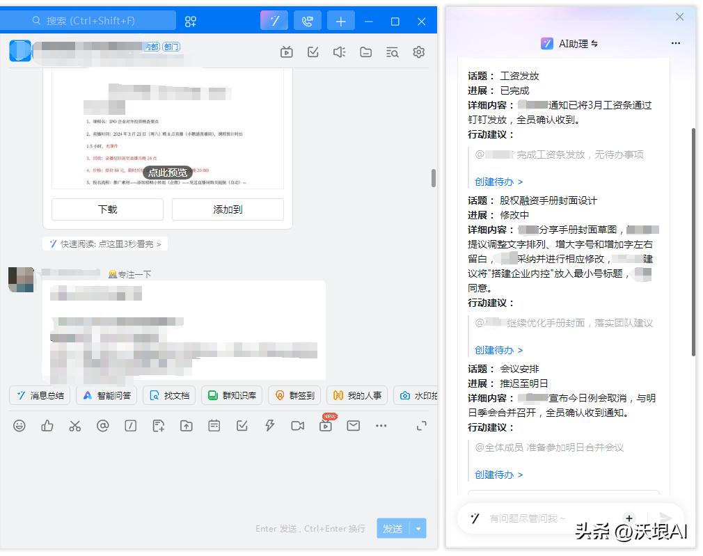 「AI助理」的速度比我快多了,几秒钟就生成了一份总结,让我可以快速知道今天各个群里的讨论话题、项目进展、细节内容等等,比我自己“爬楼”的效率高多了。