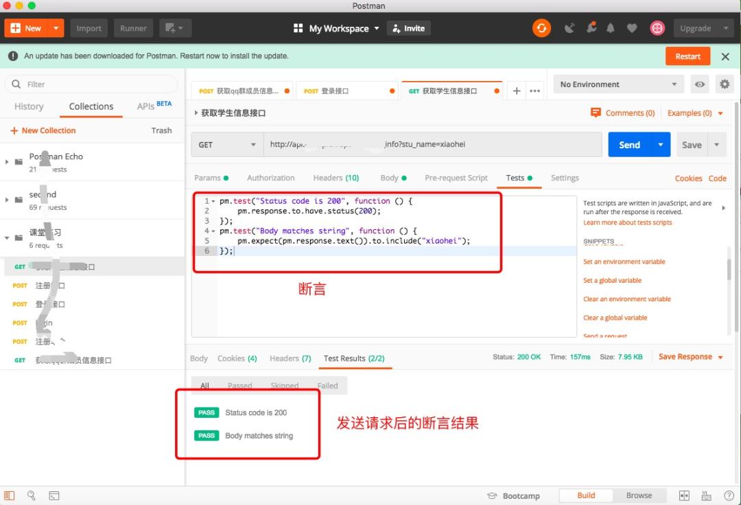 Tests:请求后脚本,Javascript语法,用于请求返回后做一些处理或断言结果