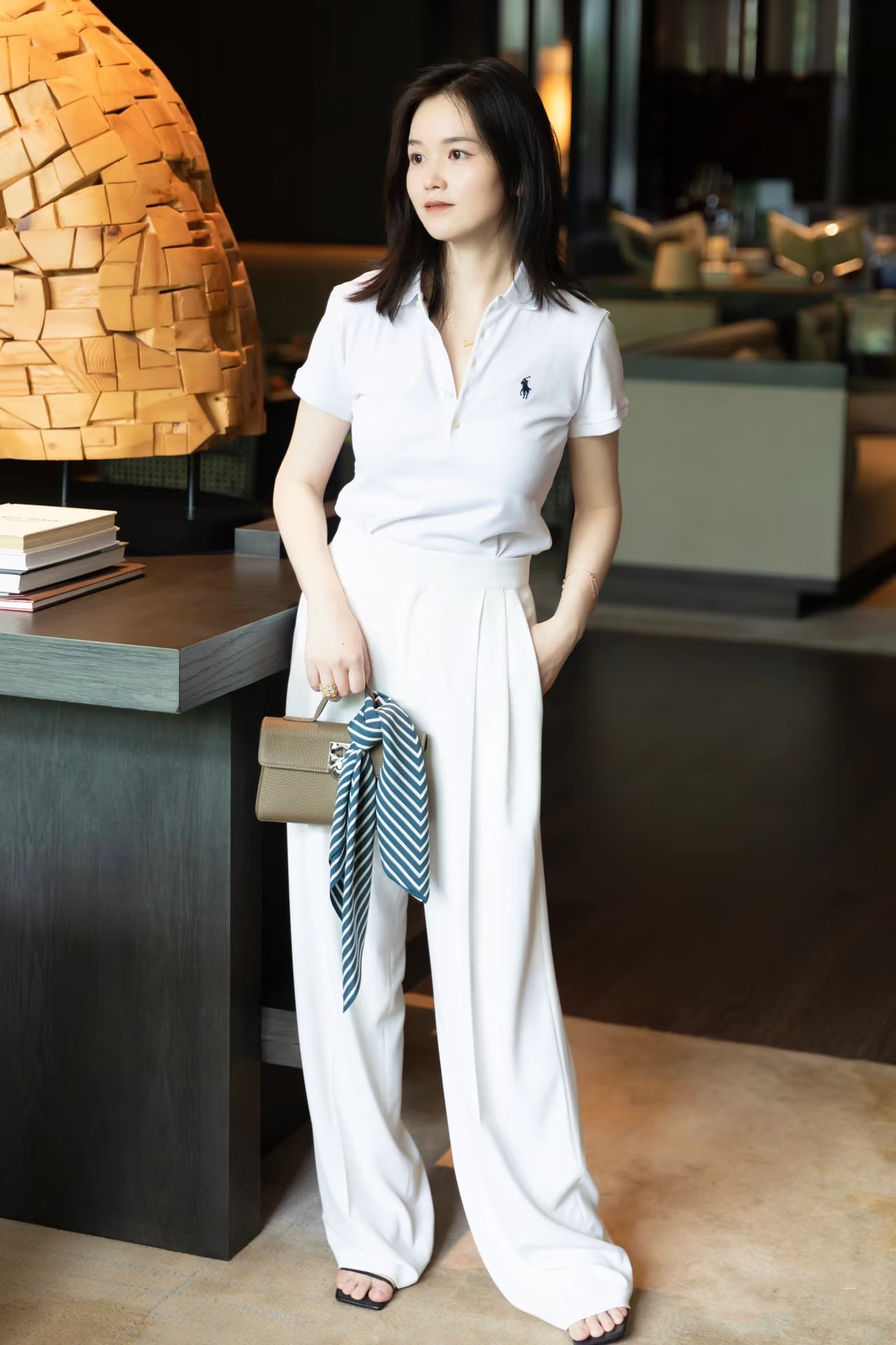 阔腿裤对腿型的包容性很强,只要版型合身且面料垂感佳,搭配POLO衫基本都不会出错。重点在于上半身细节拿捏,可以适当解开衣领的几个扣子,增加脖颈露肤拉长脖颈线条,小V领效果配合手臂留白,配合阔腿裤整体身形显得更加轻盈修长,即便是身高不是很出挑,也能轻松穿出轻盈显高的效果。