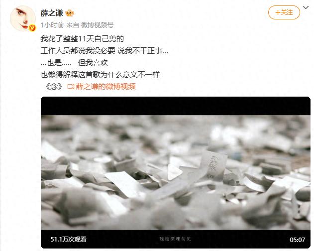 4月22日,薛之谦发文:我花了整整11天自己剪的,工作人员都说我没必要 说我不干正事……也是…..