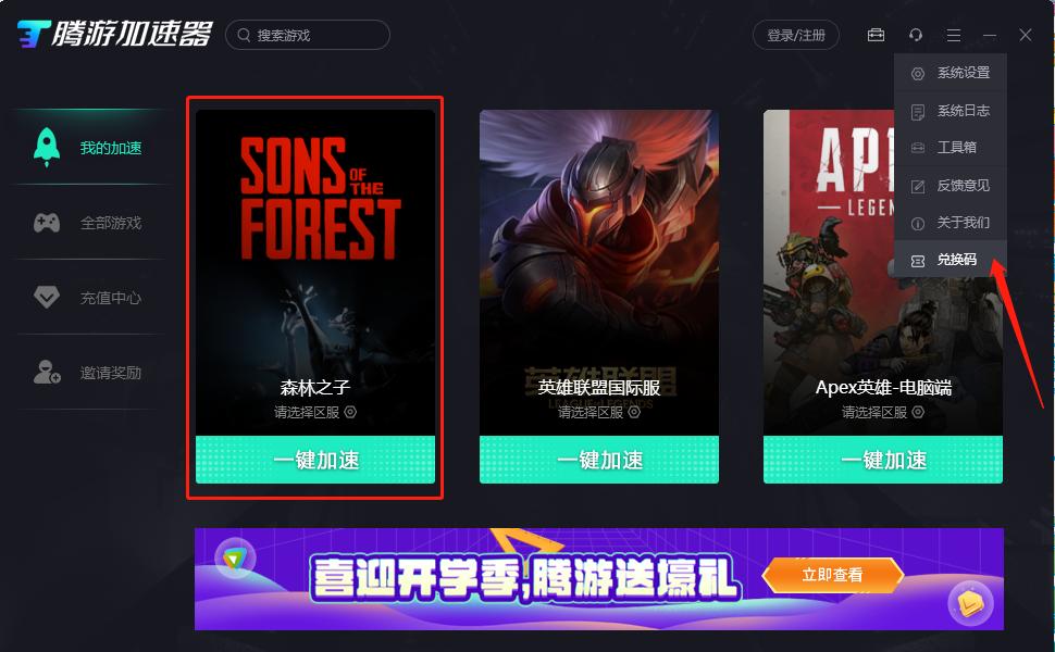 森林之子Sons Of The Forest是一款外服游戏,因为服务器远在海外的缘故,所以很多问题特别是无法连接、无法进入游戏这类的问题,都是因为网络没有联机成功的话对游戏服务器导致的,所以玩家需要用加速器来稳定连接海外网络。使用腾游加速器加速森林之子,新注册用户登录就送5小时免费时长,输入兑换码【TGW4BT】再多领48小时免费时长,快来试试吧。
