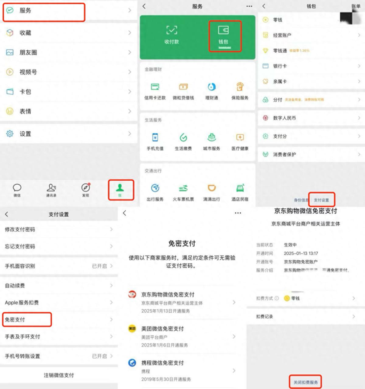 以主流支付机构为例,在打开支付宝App中,点击首页右下角“我的”—右上角“设置”—“支付设置”—“自动续费/免密支付”,在“免密支付”中可选择相应App后点击“关闭服务”。在微信App,可以查看微信支付授权的扣费服务,用户在微信页面右下角“我”—“服务”—“钱包”,再通过支付设置便可找到“免密支付”,选择相应App后可进一步点击“关闭扣费服务”。