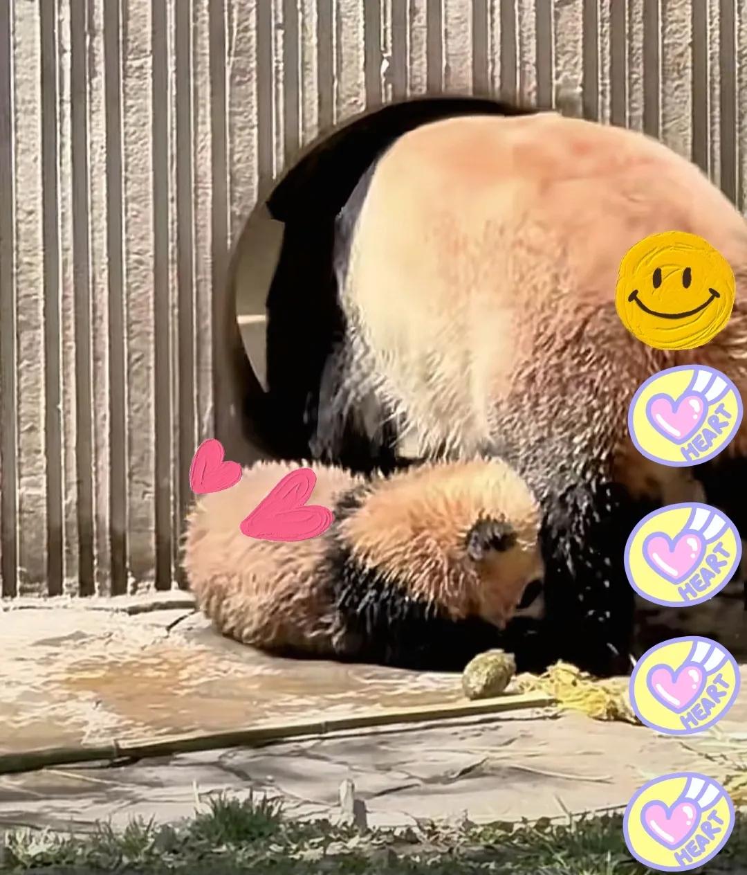 大熊猫飞虹又遭妈妈绅缤嫌弃了,一脚把它踹倒在家门前青团旁!