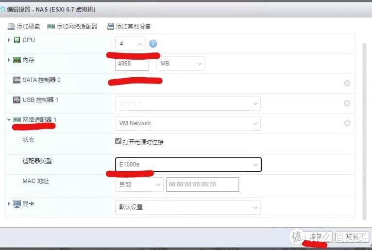 CPU——内存——网络适配器1——适配器类型——E1000e——完成配置