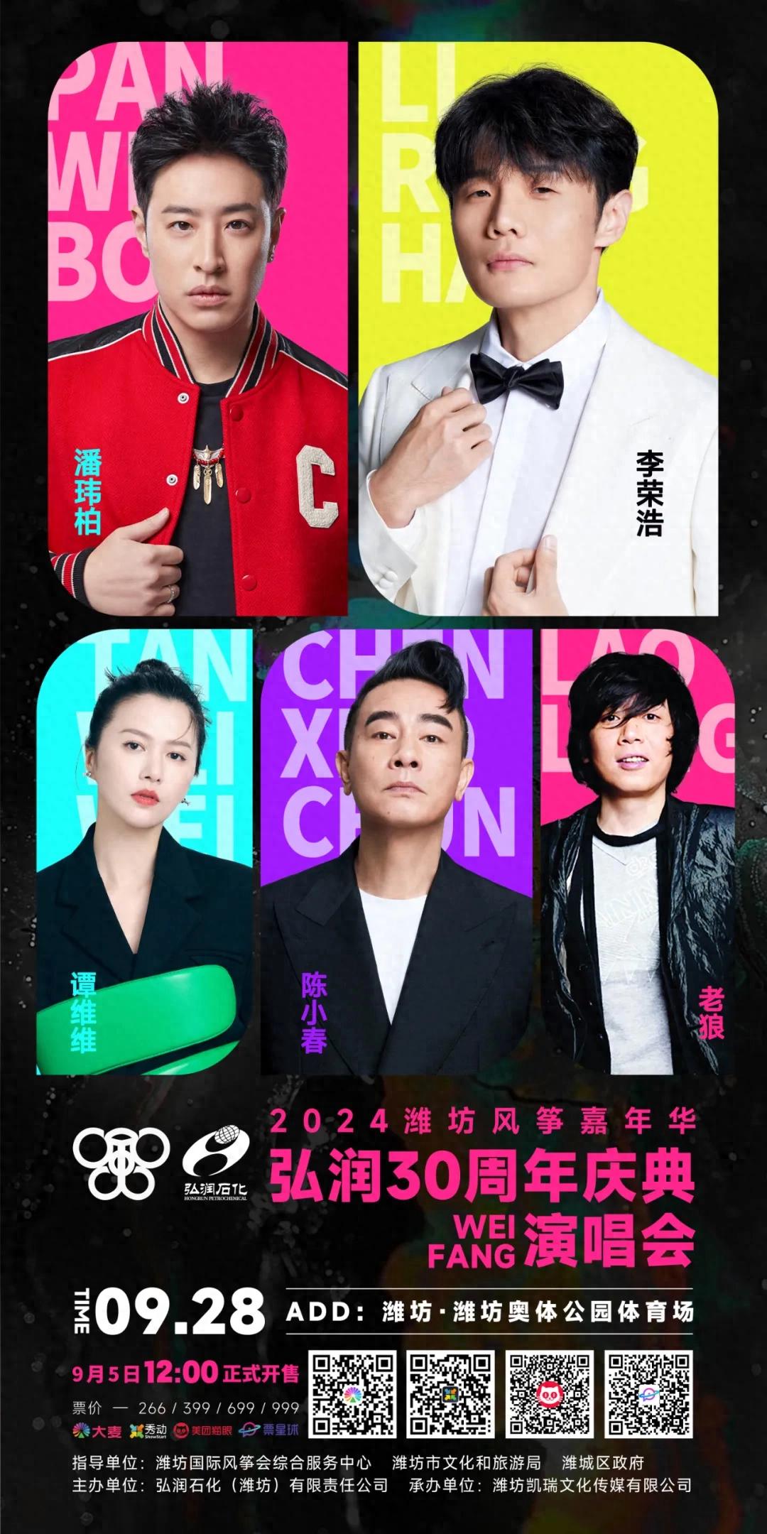 2024潍坊风筝嘉年华弘润30周年庆典演唱会门票将在大麦网、秀动ShowStart、美团猫眼、票星球同步开售。售价分为266元/人、399元/人、699元/人、999元/人四个票段。