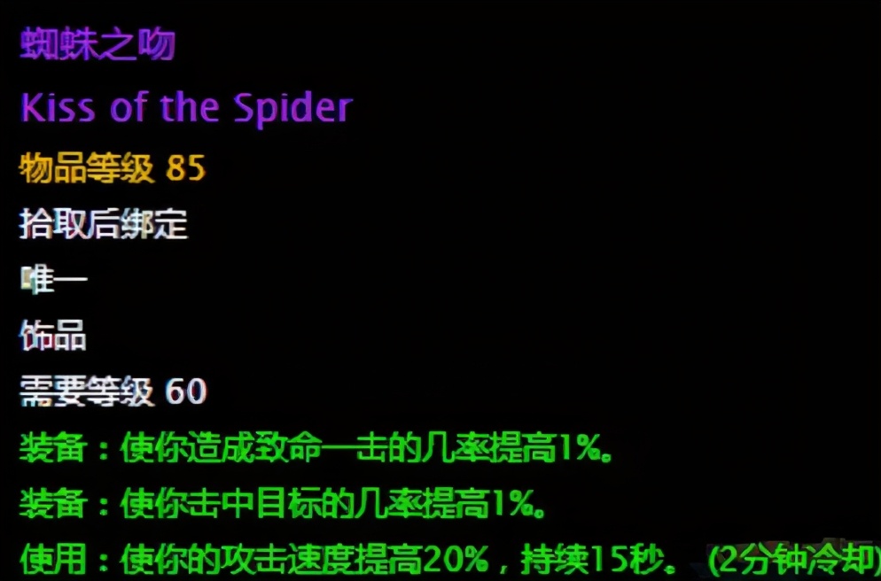 蜘蛛之吻:这个饰品掉落于蜘蛛区尾王迈克斯纳,是一个强力的饰品,我们来看看它的一个属性,首先蜘蛛之吻是怀旧服绝无仅有的可以提升攻击速度的一个饰品,在装备后可以使玩家攻击速度20%,可以持续15秒,除此之外,这个饰品还可以提供1命中1暴击,这两个属性百搭的,可以说有了这个饰品后,把龙牙饰物换下了都没有什么问题了,但是我们都知道这个饰品在魔兽世界任何时期都是竞争最激烈的,更何况是这个这样的极品饰品,到时候肯定有不少的玩家为了拿下它而争破了头。