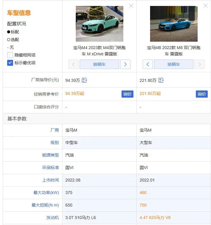 宝马M4和M8单拿出来做对比,好像也看不出多大差别,价格可差不少