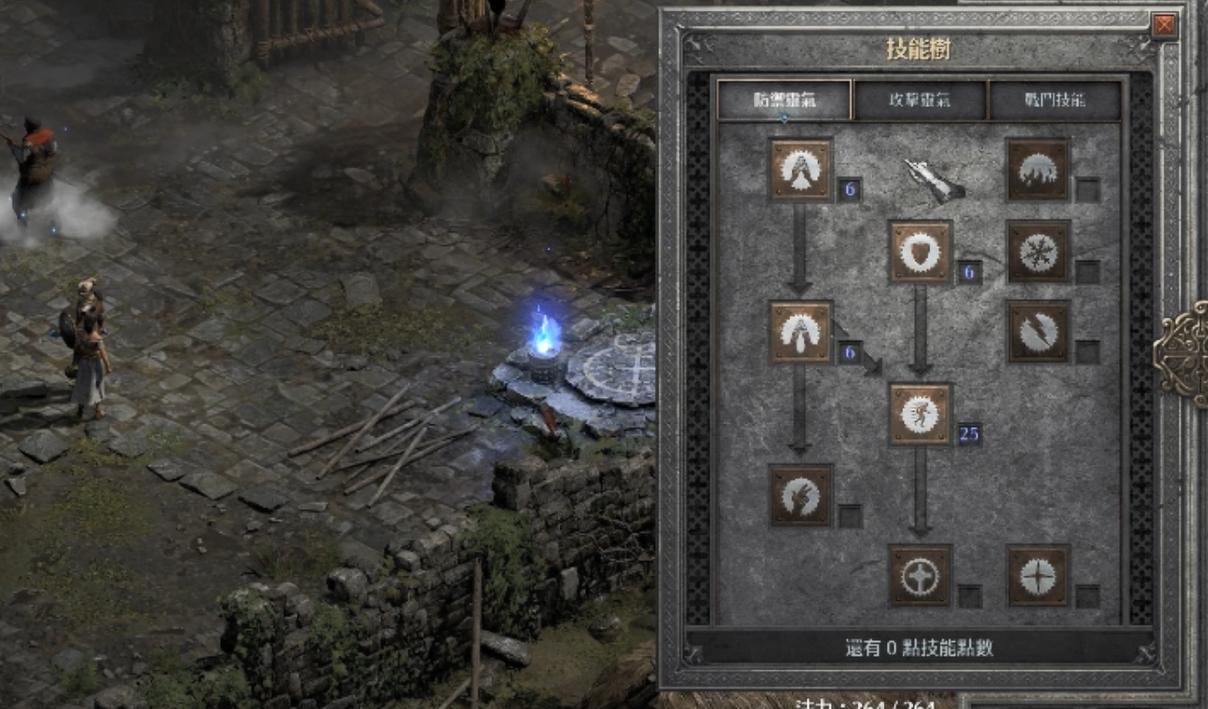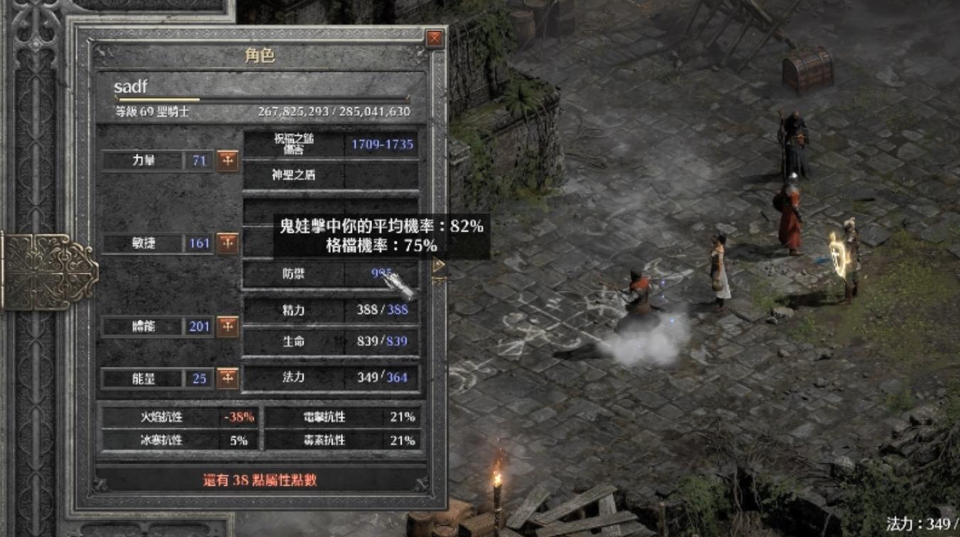 属性方面力量加到够穿装备,敏捷要加到开完神圣之盾后有75%的格挡,其他的全部加到体力上,这样我们面对物理攻击的怪物就完全不用怕了,暗黑2的防御属性跟别的游戏不太一样,并不能降低你受到的伤害,只能降低你受到攻击的几率,防御越高怪物命中你的几率就越低,但是只要打中你该是多少伤害就一点都不会少,所以体力要多加点,这样才不会在高难度的游戏里被怪物秒杀,而我们圣骑士因为有神圣之盾的存在,再加上有额外的格挡加成,所以只需要加点敏捷就很容易就能达到75%的格挡几率,也就是说即使怪物的物理攻击没有被防御到,也有75%被格挡下来,怪物的物理攻击命中我们的几率连1/4都不到,所以纯物理攻击的怪物对圣骑士的威胁并不大,而且像冥河娃娃的爆炸之类的伤害也能被格挡下来,所以圣骑士的生存能力非常强,我们只需要注意远程法系怪的群体集射就行。