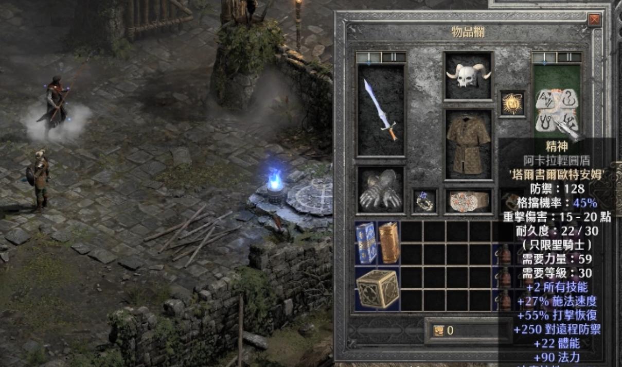 装备方面跟开荒的法师类似,做出一把精神剑和一个精神盾就足以打通地狱难度,剑我是用水晶剑做到,对力量要求比较低,盾牌则是用的圣骑专用的小圆盾,这个盾牌的底材最高是可以加45全抗性的,是圣骑的专属福利,不过我没有刷到满抗的底材,用的是加36全抗的底材做的,头盔可以做一个知识的符文头盔,加一点技能和30%的电抗,衣服我是做了一个隐秘的符文衣服,可以增加施法速度和法力恢复,手套是选择了法师之拳,也是增加施法速度和法力恢复,靴子选择了纱织,增加移动速度和法力上限,也可以选择加火抗的靴子,因为精神盾是不加火抗的,首饰则是有什么用什么,主要选择增加技能和施法速度的,然后是抗性和生命值之类的。
