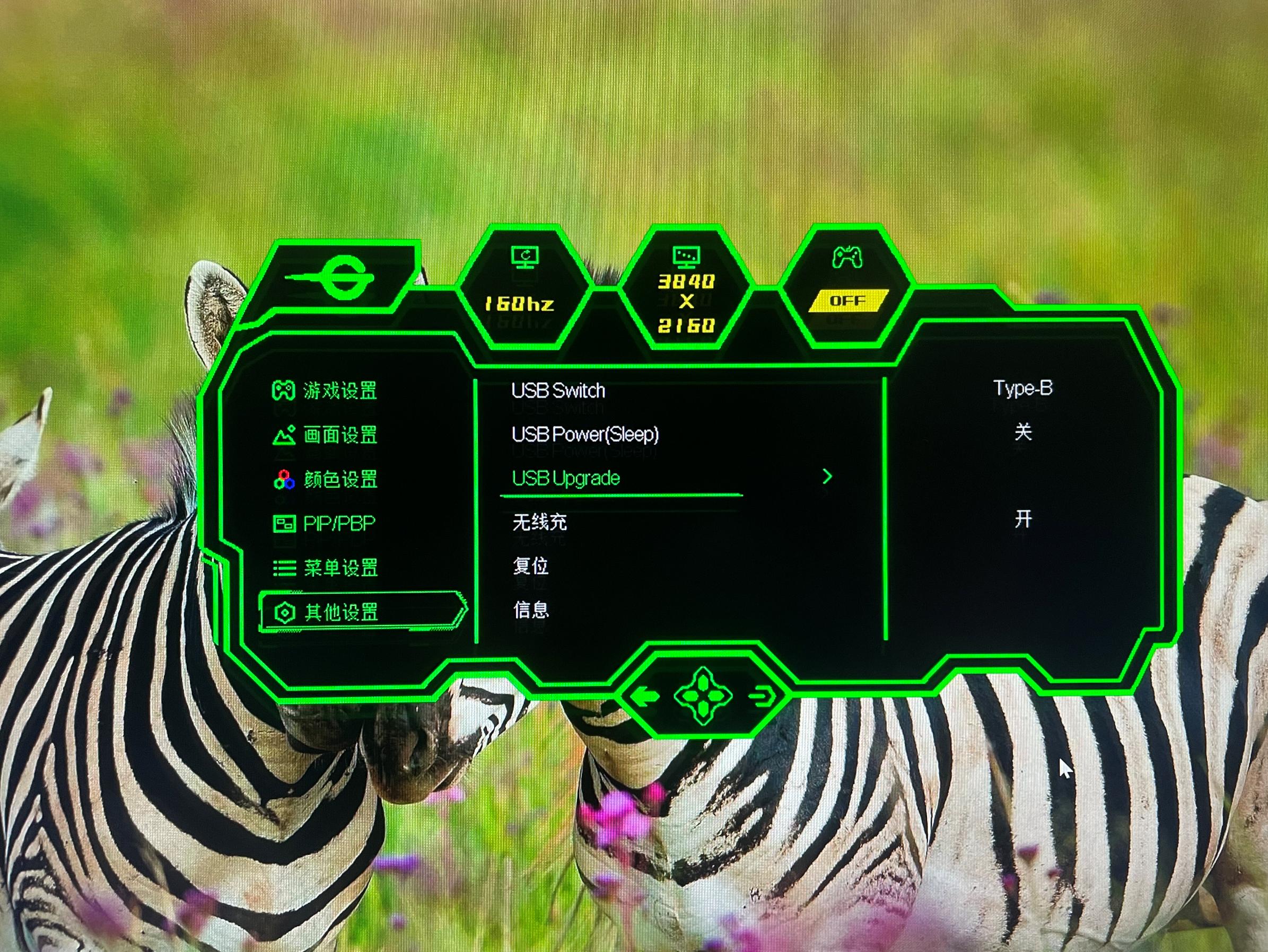 打开显示器OSD菜单,在【其他设置】中选择【USB Upgrade】这个选项,选择【是】。