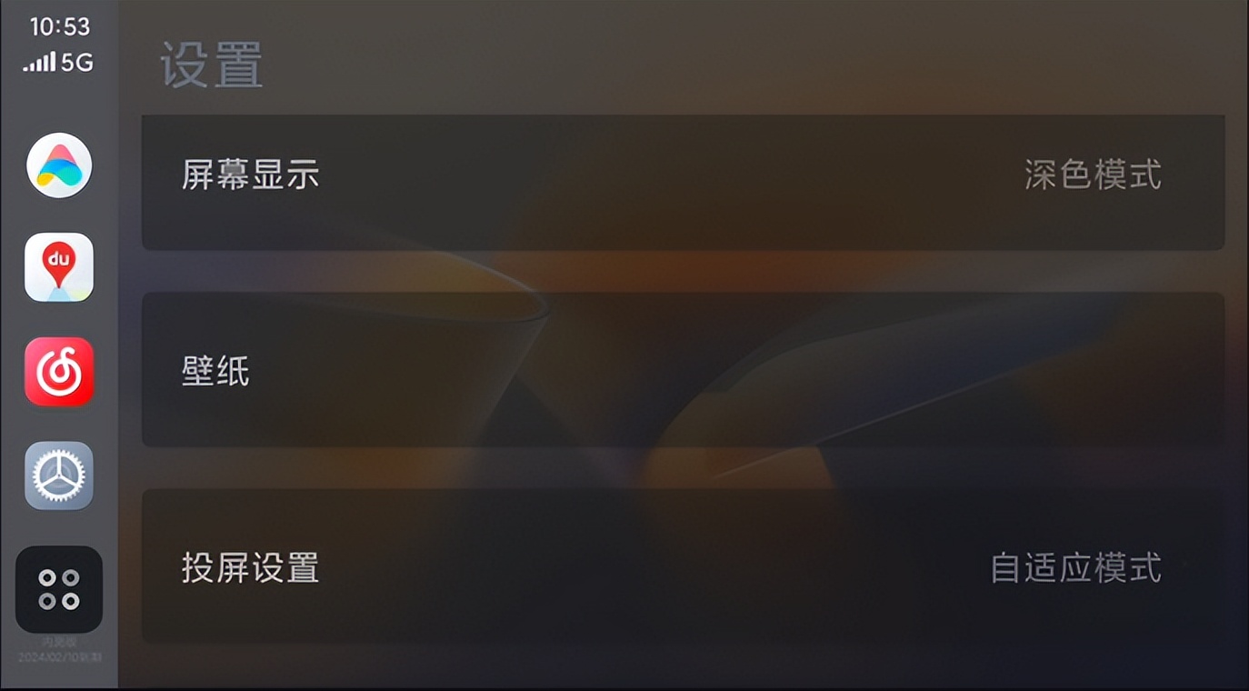 该版本上线壁纸功能,自带6种风格18个壁纸。连接后,在车机端设置壁纸中可以设定自己喜欢的壁纸,不过目前并不支持自定义。