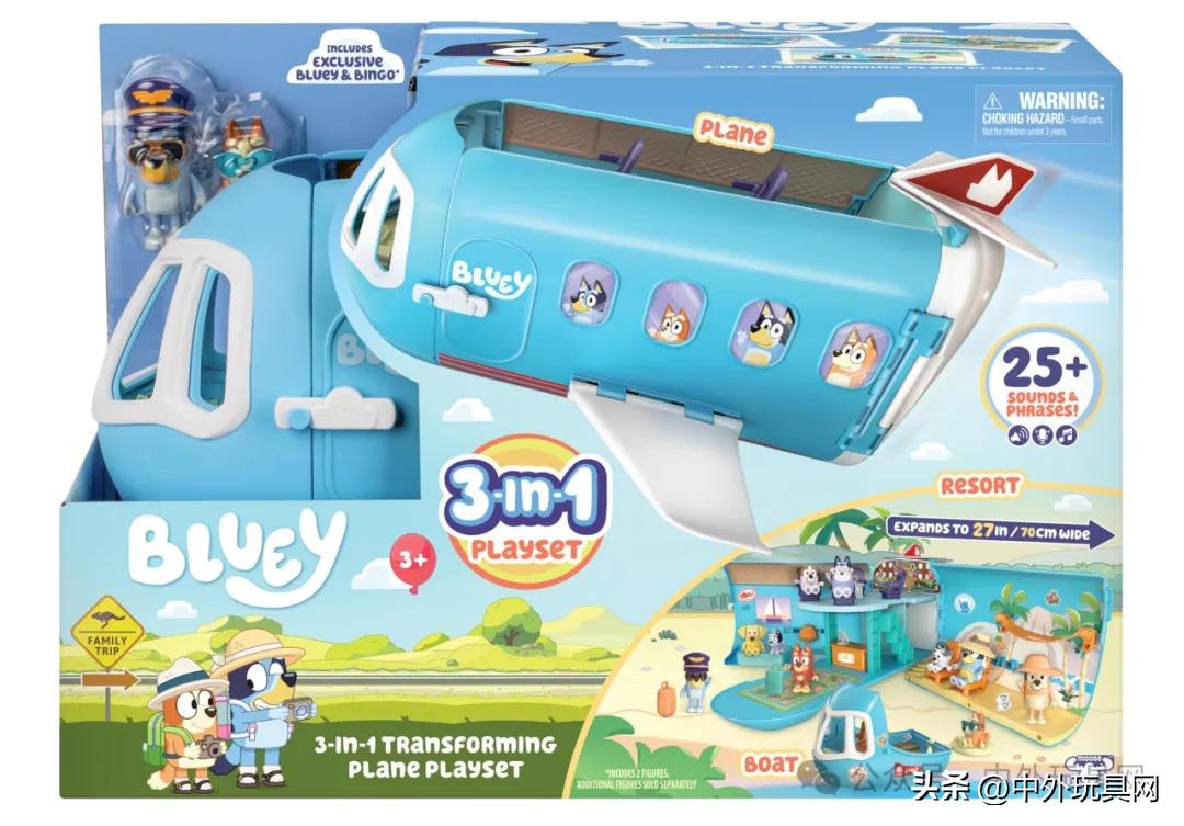 这款玩具套装可轻松将飞机变形为度假村和船只,配有两个独家人物形象:戴着飞行员帽和太阳镜的布鲁伊(Bluey)。