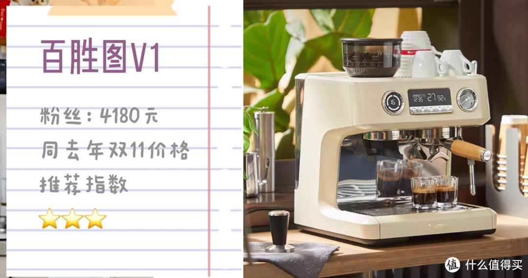 同门的V1价格是4180元基本持平去年双11,也是标杆产品了,金属机身带屏操作,3孔蒸汽在同级别一体机里比较突出,加上生产方是全球小家电代工大佬新宝,也更保障点。