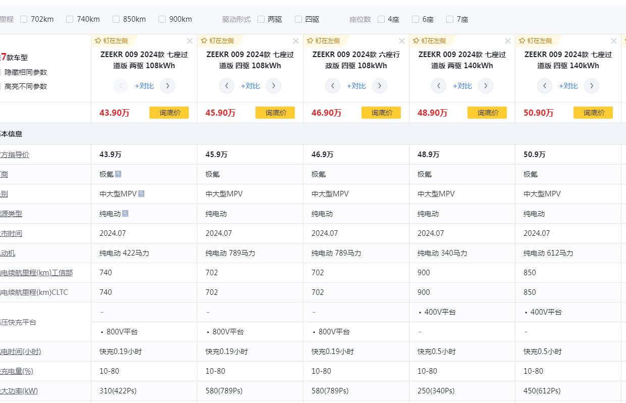 极氪 ZEEKR 009目前在售的有7款车型,有4座版,6座版,7座版,驱动形式分为两驱版与四驱版,其中续航里程最高的可以达到900公里,而今天我们要说到的是极氪 ZEEKR 009 2024 款六座行政版 四驱。