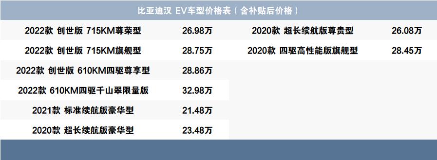 上图是目前比亚迪汉EV的全部在售车型,通过价格对比不难发现,比亚迪汉EV新上市的2022款创世版中的715km尊荣型和715km旗舰型的售价与2022款汉EV超长续航版尊贵型、四驱高性能版旗舰型价格是类似的,不出意外的话,未来2020款汉EV超长续航版尊贵型和四驱高性能版旗舰型都会陆续停产,为2022款汉EV创世版让路。