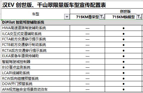 接下来我们拿2022款汉EV创世版 715km尊荣型(26.98万)作为标准,首先来看看2022款汉EV 创世版 715km旗舰型(28.75万)之间的差异。715km旗舰型比715km尊荣型的售价贵了1.77万元,配置方面新增了5个毫米波雷达传感器和1个高感单目摄像头,传感器数量增加也进一步提升了715km旗舰型的智能驾驶辅助能力,达到L2.5级智能驾驶辅助水平,可以实现HWA高速道路驾驶辅助、ILCA交互式变道辅助、APA全场景自动泊车等10余项智能驾驶辅助功能。