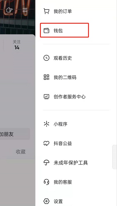 1、抖音我的中点击右上角三条斜线,然后找到钱包。