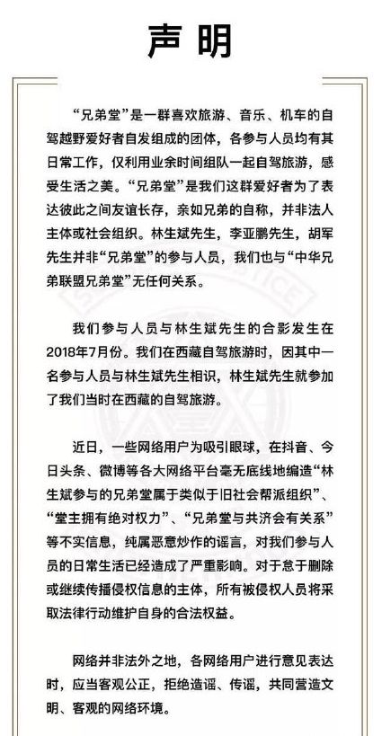 对此,“兄弟堂”组织也发文进行辟谣,再次声明“兄弟堂”只是一群喜欢旅游、音乐、机车自驾越野爱好者自发组成的团体,其中林生斌与两位男星胡军、李亚鹏并不是参与人员,与林生斌的交集也只是仅限于偶然。